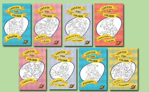 Títulos: Chapeuzinho Vermelho – Aladim – Branca de Neve – Pinóquio – Os Três Porquinhos – Cinderela – A Bela e a Fera – A Pequena Sereia